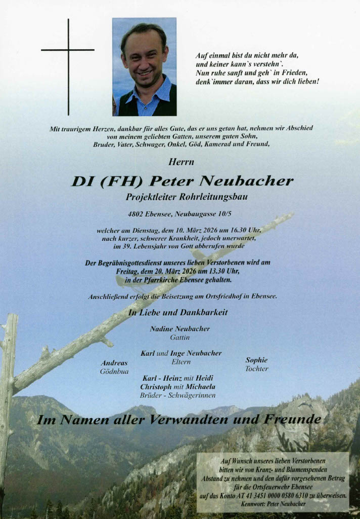Mit Peter Neubacher verliert die Feuerwehr Ebensee nicht nur einen Freund, sie verliert auch einen ihrer engagiertesten Kameraden des aktiven Dienstes. Möge er in der ewigen Heimat einen guten Platz finden und sein Feuerwehrgeist noch viele weitere Menschen für den Dienst in der Feuerwehr inspirieren.