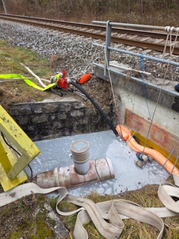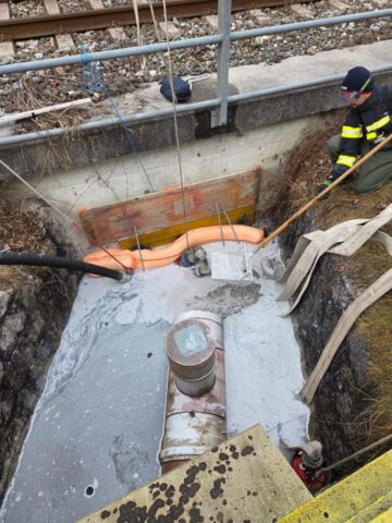 Dazu dichteten die Einsatzkräfte das Ende des betroffenen Abwasserkanals ab und errichteten mehrere Rückhaltesperren, um sicherzustellen, dass das Material sich nicht unkontrolliert verteilt.