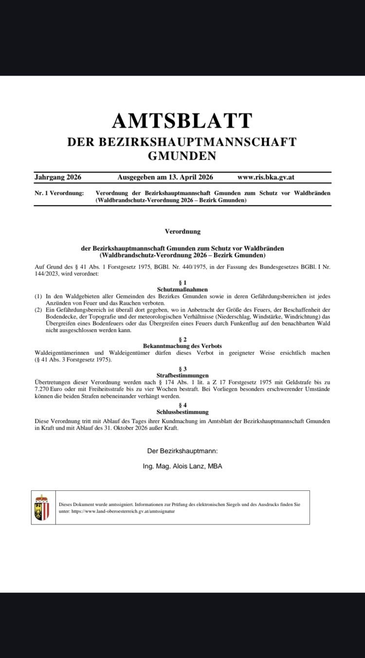 Von der Bezirkshauptmannschaft Gmunden ist heuer wieder eine Verordnung betreffend den Waldbrandschutz für die Waldgebiete aller Gemeinden des Bezirkes Gmunden erlassen worden. In den Waldgebieten aller Gemeinden des Bezirkes Gmunden […]