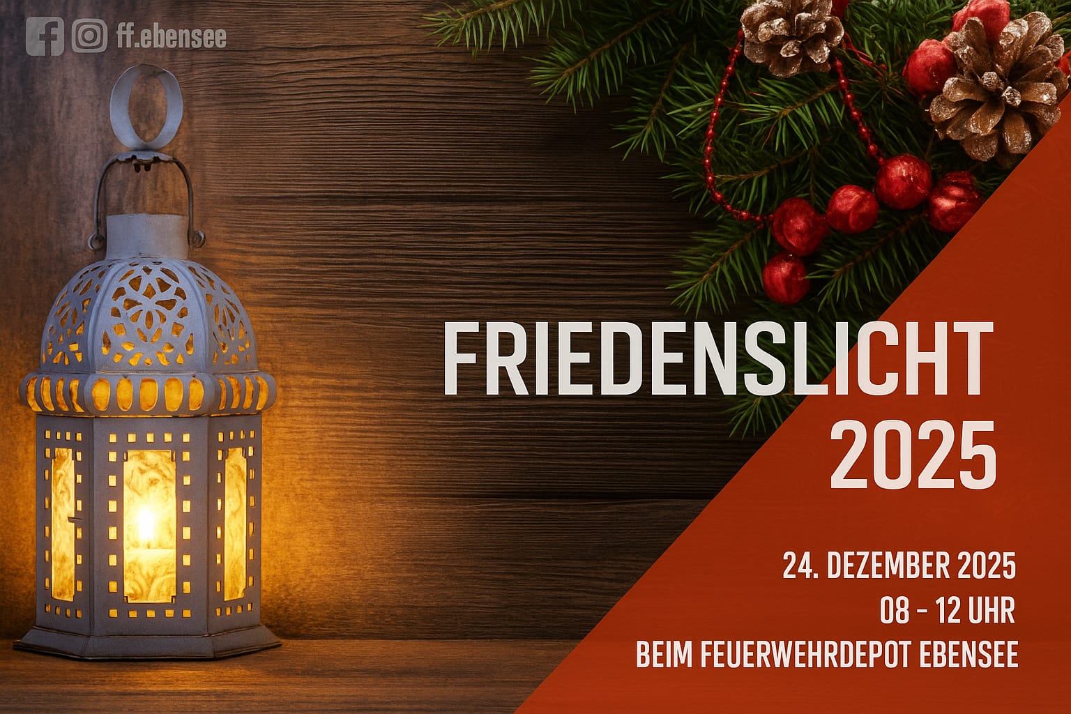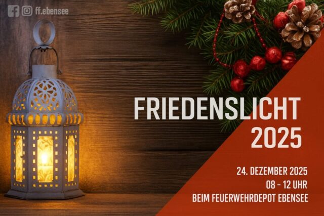Auch heuer besteht wieder die Möglichkeit, das Friedenslicht am 24. Dezember von 8:00 bis 12:00 Uhr im Zeughaus der Freiwilligen Feuerwehr Ebensee (Salinenplatz 5) abzuholen.