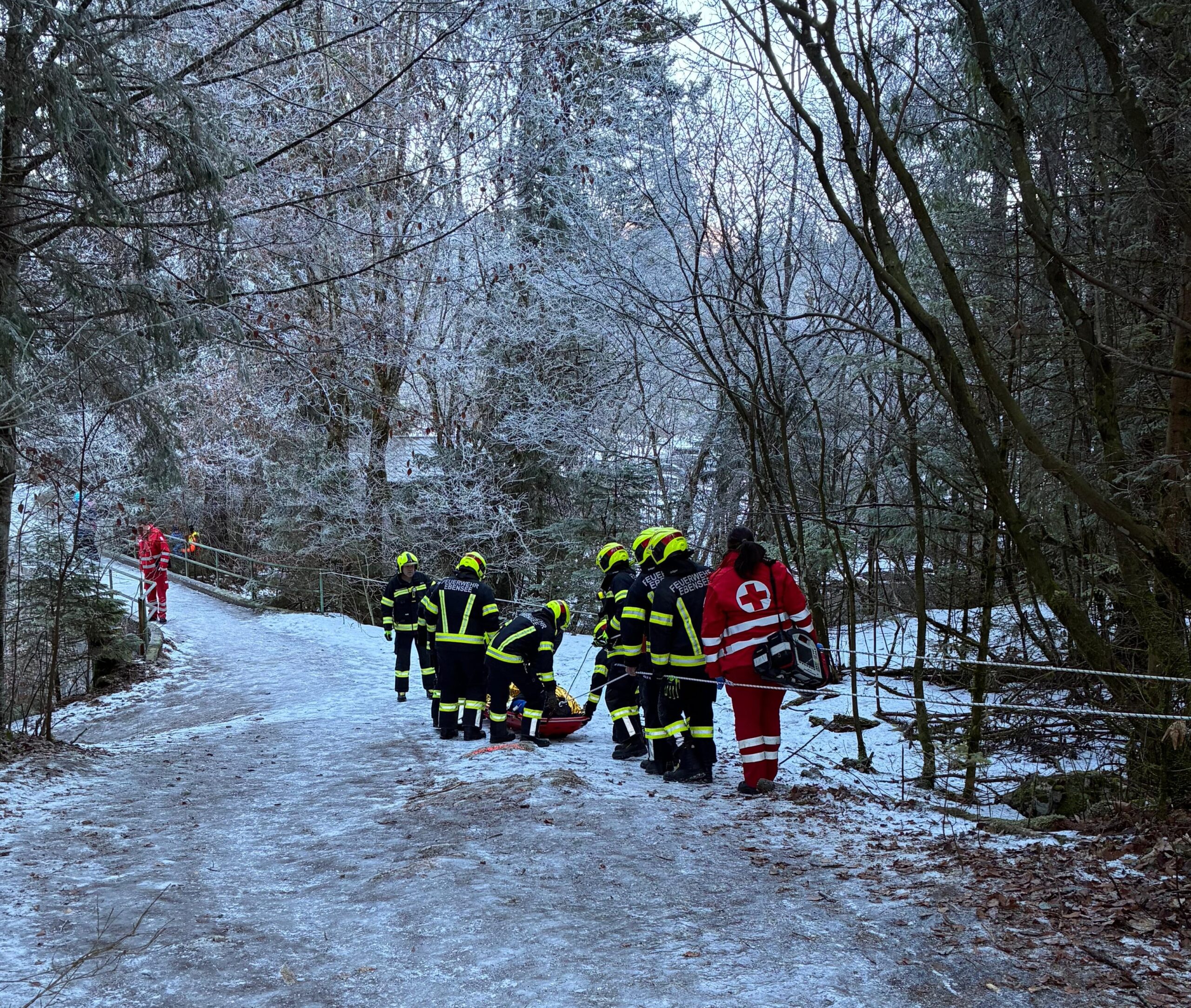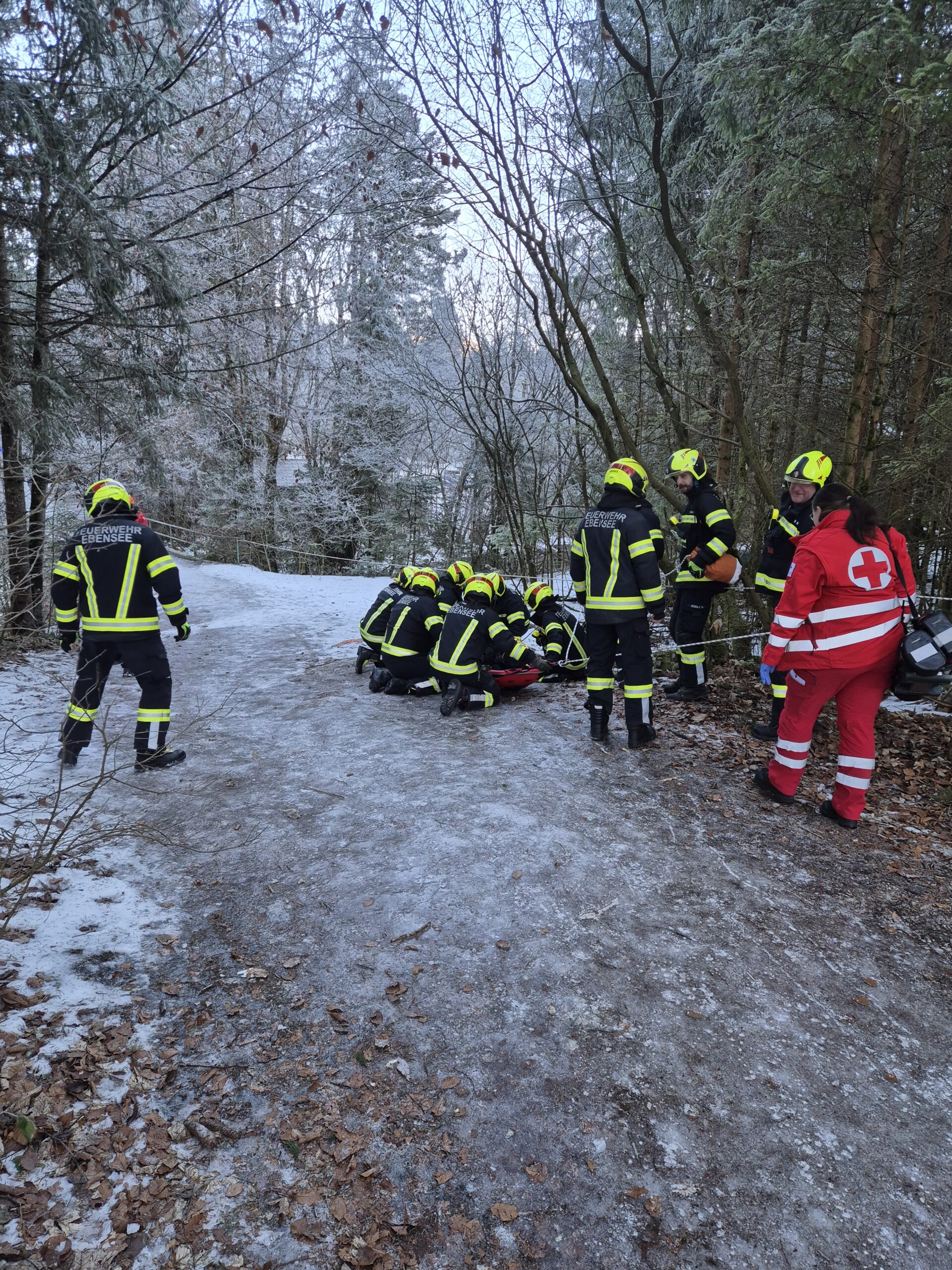 Im Bereich des Langbathsees war eine Person gestürzt und nicht mehr gehfähig. Aufgrund der sehr eisigen Bedingungen wurde die verletzte Person im steilen Abschnitt des Weges mittels Rettungsleine gesichert. Zusätzlich errichteten die Einsatzkräfte ein Seilgeländer zur Sicherung der Einsatzkräfte, um ein sicheres Arbeiten zu ermöglichen. Anschließend erfolgte der Transport der verletzten Person zum Rettungswagen.
